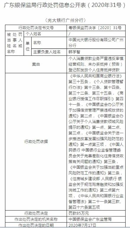 銀行方面,光大銀行廣州分行因存在個人消費貸款業務嚴重違反審慎經營規則、未辦妥抵押(預告)登記即發放個人住房抵押貸款的違法違規行為,廣東銀保監局對其予以罰款85萬元。