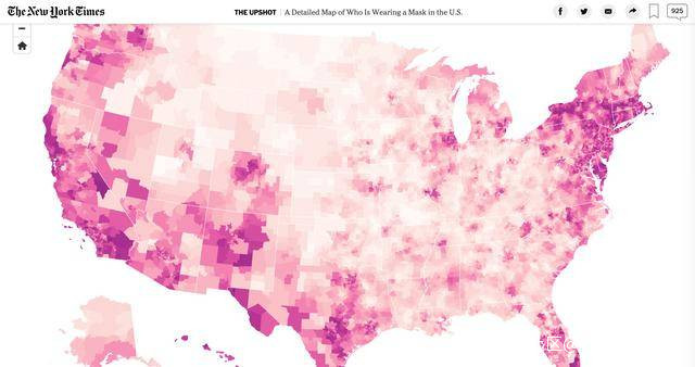 (圖説:7月17日,《紐約時報》發佈數據地圖,顯示美國各地隨機遇到戴口罩路人的幾率。紫色越深,代表着隨機遇到的人全部戴口罩的幾率越高。)