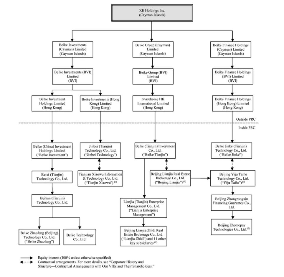 貝殼找房在招股書中提到,貝殼找房2018年7月在開曼羣島註冊成立了KE Holdings Inc.作為控股公司,同時其外商獨資企業(WFOE)與鏈家、天津小屋信息科技有限公司(下稱“天津小屋”)、北京宜居泰和科技有限公司(下稱“宜居泰和”)訂立了一系列經修訂和重申的合同安排,通過它們搭建了KE Holdings Inc.控股的VIE架構。