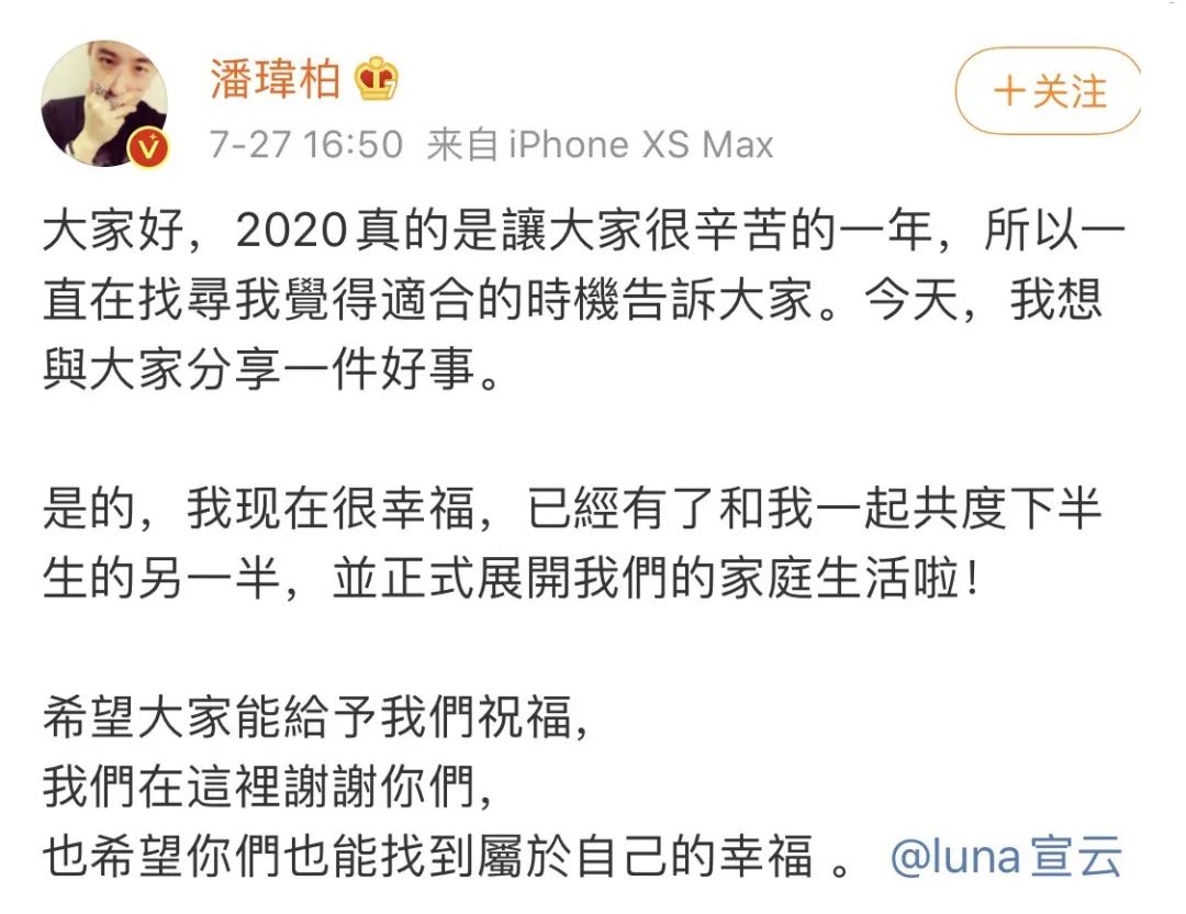 昨天,39歲的潘瑋柏發微博公開婚訊