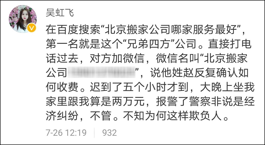 25日晚,微博認證為幸福大街樂隊主唱的歌手@吳虹飛 發文稱,自己在搬家過程中遭到搬家公司訛詐,一千多的費用變為兩萬多。相關微博迅速引發輿論關注,而網友也注意到涉事公司疑似存在着坐地起價的前科劣跡。