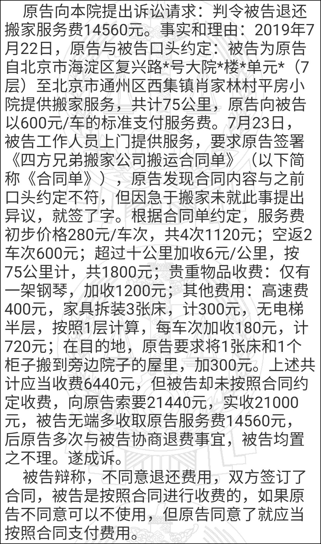 查詢中國裁判文書網得知,此案中,原告丁某於去年7月23日從北京海淀區搬家至通州區。過程中,原告發現拿到的合同內容與之前口頭約定不符,但是因為時間急迫沒有提出異議。根據合同,各項費用合計應當是6640元,但是被告在搬家結束時卻向原告索要了21440元。