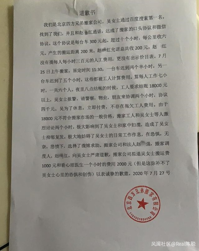 而在7月27日,吳虹飛向媒體提供了一份來自北京四方兄弟搬家公司的道歉書。