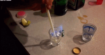 正常來説,玩這種花活要用厚實、容量小的shot杯,用可樂杯玩這個會讓別人以為你是在用火盆做法事祭天。