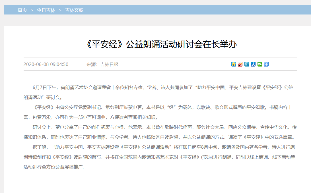 《吉林日報》也發表了關於“《平安經》公益朗誦活動研討會”的新聞通稿,並且被吉林省人民政府新聞辦公室轉載。
