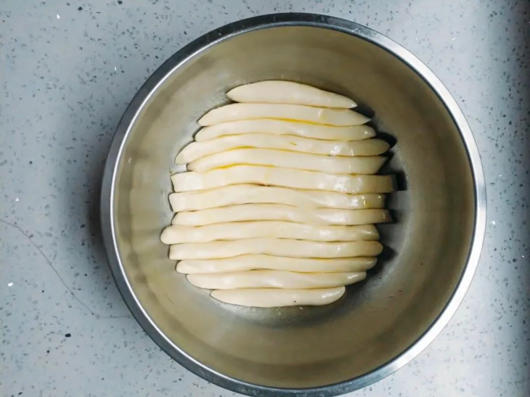 抹上油醒好後,沿着邊緣將麪餅用刀切成一根一根,再拉長下鍋。