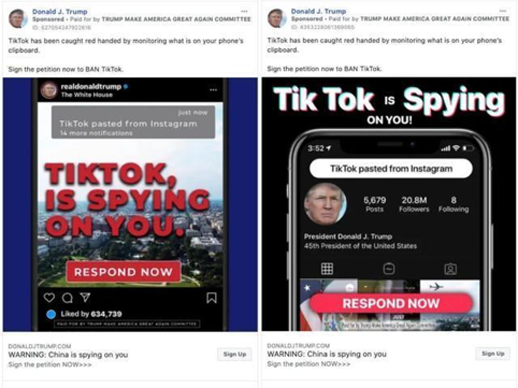 TikTok在美國的遭遇主要源於以特朗普為首的政治集團和以扎克伯格為首的經濟集團的沆瀣一氣的聯合打壓。現在的局勢是禿頭上的蚤子,明擺在那兒了。出於連任選舉的需要,特朗普跟中國槓上了,包括無辜的中國企業,華為第一,TikTok第二。現在特朗普的競選廣告已經密集出現在Facebook及旗下的 Instagram平台,多次提到“TikTok監視隱私”,據《商業內幕》網站統計,從7 月17日到 21 日,特朗普團隊發佈了 450 條抨擊TikTok的廣告,花費高達8萬美元,其中觀看次數最多的是一條用紅色粗體字赫然寫着“TikTok is spying on you”(TikTok 正在監視你),Facebook 將其至少分發給了 40 萬用户。