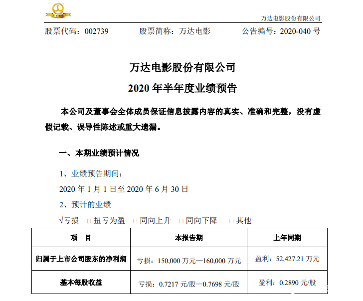 2020年7月15日,萬達電影發佈2020年上半年業績預告顯示,預計上半年虧損15億元至16億元,而2019年同期則盈利5.24億元。基本每股收益虧損0.72元-0.77元,2019年同期基本每股收益為0.29元。