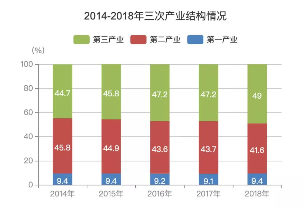 如果去看徐州三大產業的結構就會發現,這五年來其第三產業一直處於比重增長,第二產業處於比重下降的狀況。這其實和徐州目前正在採取的產業轉型有着密切關係。