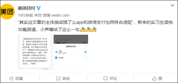 當天下午,“快科技”以《美團回應取消支付寶支付:餓了麼App也不支持微信支付》為標題,報道了美團對此事的回應。報道貼出了一張@美團月付 官方微博的截圖:“其實這文章的主體換成餓了麼app和微信支付也同樣合適呢”,新來的實習生讀完36氪報道,小聲嘀咕了這麼一句。