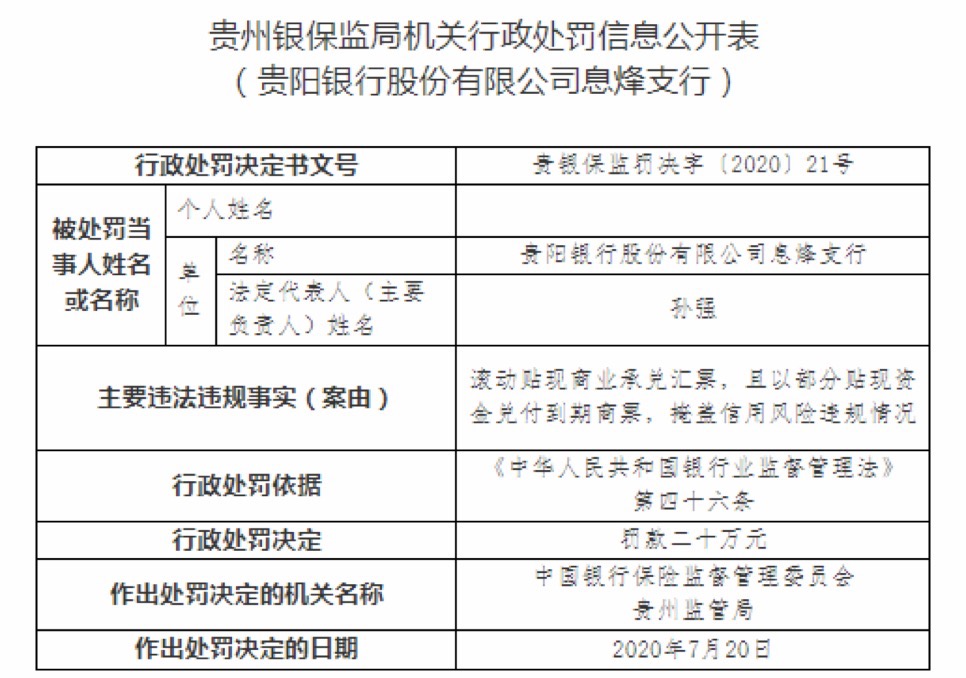 而貴陽銀行息烽支行則因滾動貼現商業承兑匯票,且以部分貼現資金兑付到期商票,掩蓋信用風險的違法違規情況,被銀保監會貴州監管局予以罰款20萬元的處罰。