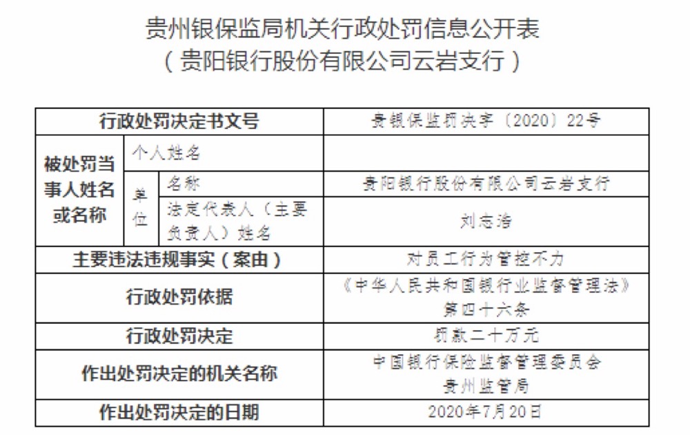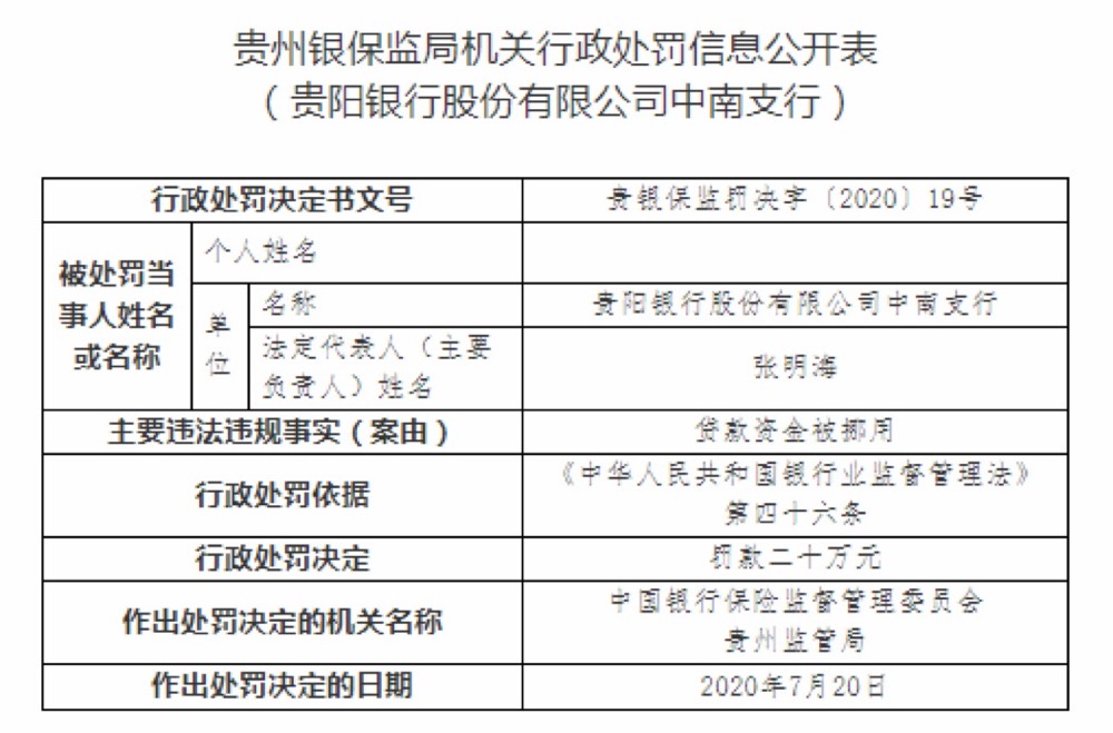 貴陽銀行中南支行因貸款資金被挪用,被責令罰款20萬元。