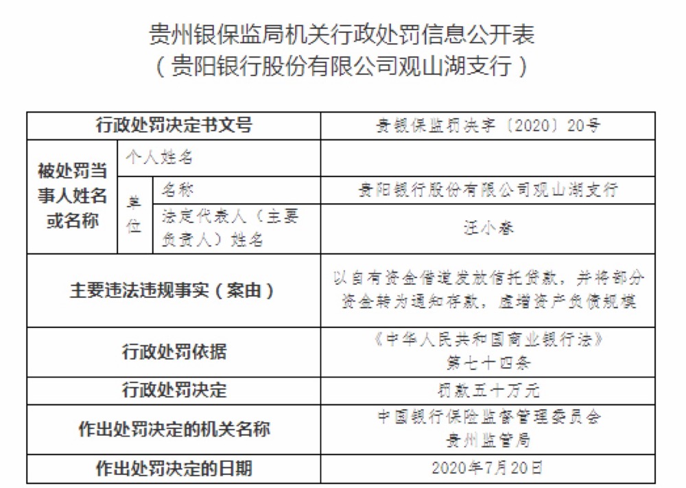 此外,貴陽銀行觀山湖支行因以自有資金借道發放信託貸款,並將部分資金轉為通知存款,虛增資產負債規模,被責令罰款50萬元。