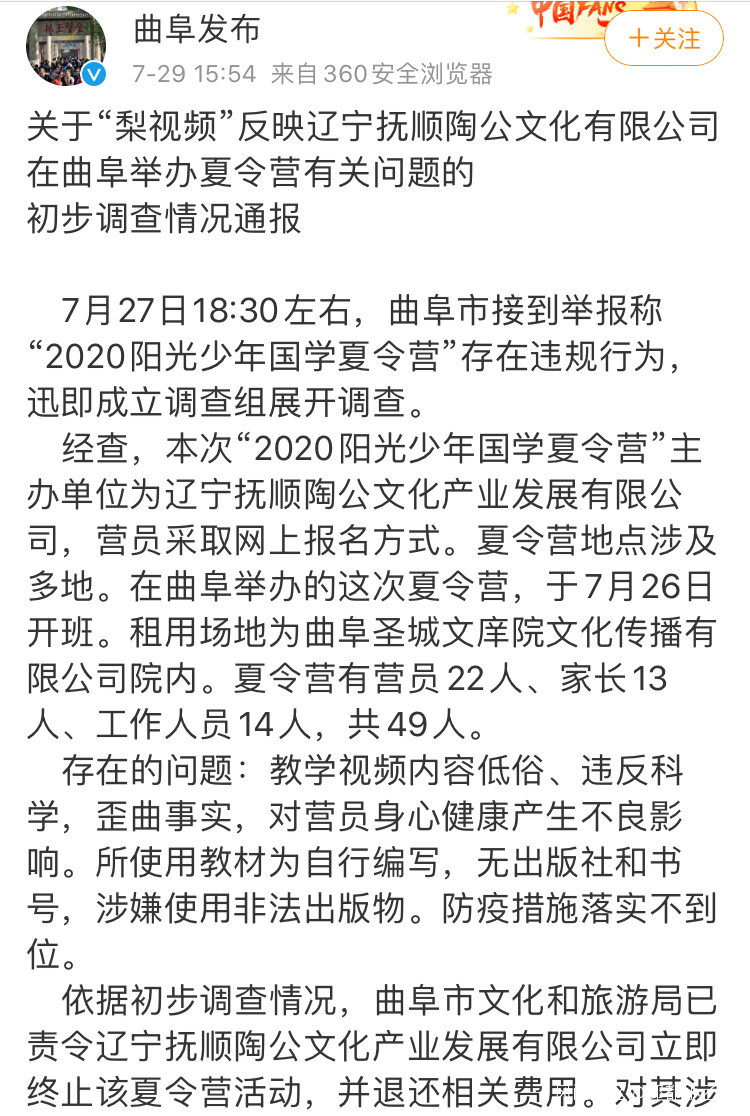 目前,曲阜市文旅局已責令主辦單位立即終止夏令營,並退還相關費用。對其涉嫌的其他違法違規行為,公安機關及相關部門正在進行深入調查。