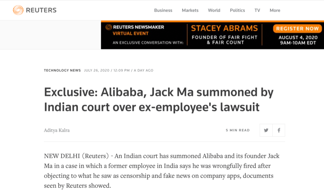 馬雲被印度政府告上法庭,這則消息最早的出處來自路透社的獨家。看似勁爆,實則無聊。乍一看我們的馬爸爸要被印度人送上法庭賠償,但實際上這其實只是一則普通的“被裁員工與前東家”因為勞資糾紛引起的鬧劇。
