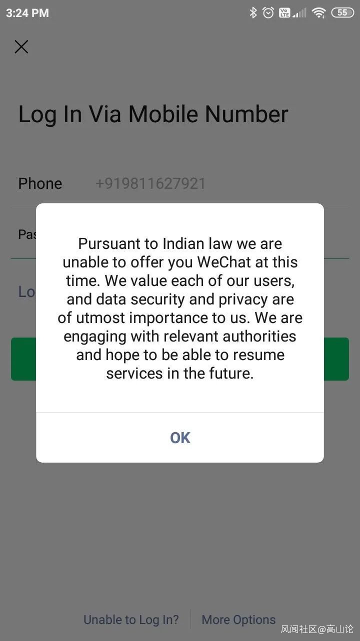 從25日開始,很多在印度的微信用户突然發現,他們在正常使用微信時被強制登出,在登出後界面上顯示彈出了一個對話框。在對話框上寫道:“根據印度法律,我們目前無法為您提供微信服務。我們重視每一位用户,數據安全和隱私對我們來説也至關重要。我們正在與相關部門接觸,希望未來能夠恢復服務。”
