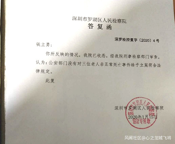 針對侵權案中的上述主張,錢序德曾向深圳市公安局羅湖區分局和羅湖區檢察院要求調閲案卷。今年1月15日,羅湖檢察院回函答覆稱,經該院刑事監察部門審查認為,公安部門沒有對三位老人非正常死亡事件給予立案符合法律規定。