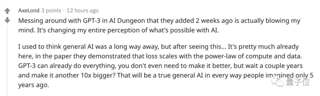 有reddit網友認為,GPT-3的出現證明了通用人工智能不會太遙遠。GPT-3已經做了可以做的一切,我們甚至不需要做得更好,只要再等幾年,等算力增強,把數據集再擴大10倍。