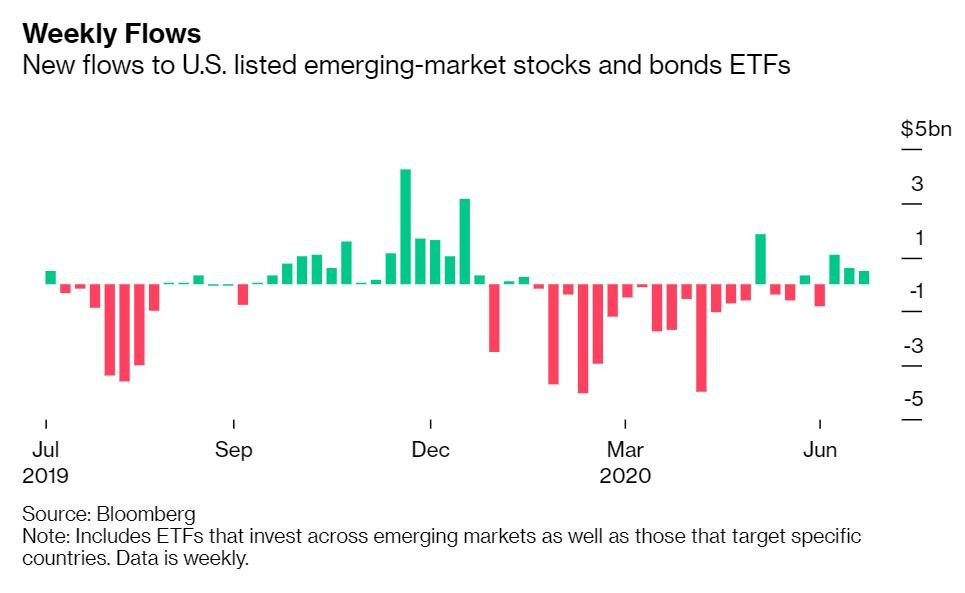 數據顯示,投資發展中國家股票的ETF 上週增加了3.348億美元,超過了關注債券的同類基金1.550億美元的增幅。在專注於債券的發展中國家ETF中,156億美元的iShares JP Morgan USD Emerging Markets Bond ETF (EMB)獲得1.888億美元,而Invesco Emerging Markets Sovereign Debt ETF (PCY)則遭遇了3,570萬美元的贖回。