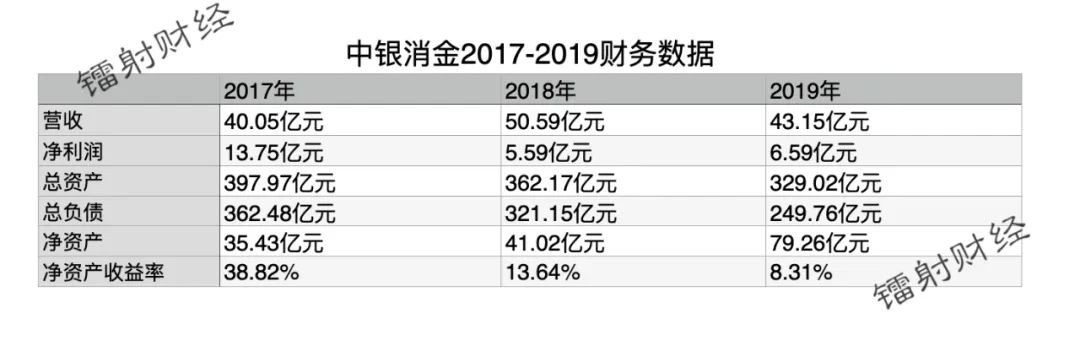 從近3年財務數據來看,中銀消金營業收入停滯不前,2017-2019年營收分別為40.05億元、50.59億元、43.15億元;淨利潤在腰斬過半後小幅回升,2017-2019年分別為13.75億元、5.59億元、6.59億元。