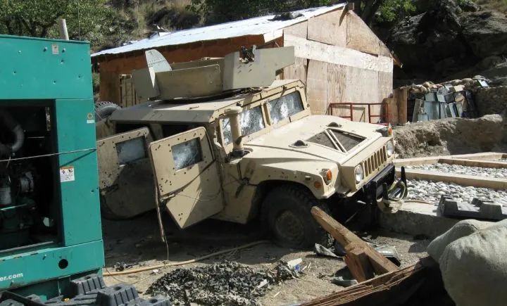 還有一輛被擊毀的悍馬車裏擠了5個人,車頂機槍壞掉後就貓在車裏不敢出來,另一輛悍馬車打算開過去救他們,結果被自己基地的水泥坎卡主動彈不得,下車逃跑時被塔利班打死。