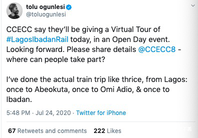 開放日當天,尼日利亞總統數字新媒體特別助理tolu ogunlesi在推特上與大家互動:“今天尼日利亞拉伊鐵路跟大家雲開放,希望更多的人來參與。我曾經坐過三次中土線路上的火車,體驗真是太棒了”。