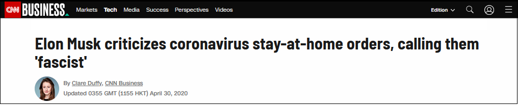 對於政府頒佈的“居家令”,馬斯克甚至稱其為“法西斯主義”。