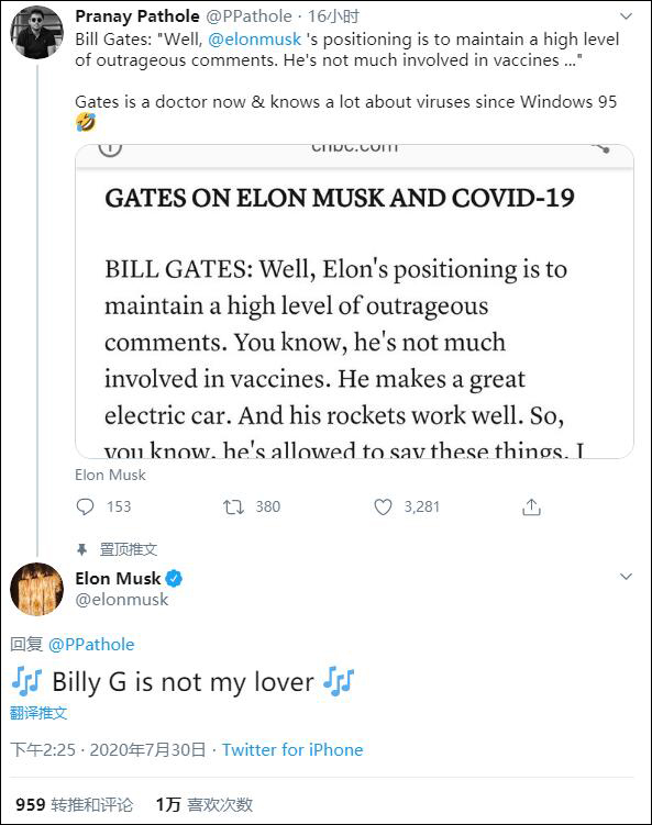 在此之前,有網民將一段比爾·蓋茨接受美國全國廣播公司財經頻道(CNBC)採訪的截圖發給馬斯克看,馬斯克對此回應説:“比爾蓋茨不是我的戀人”。