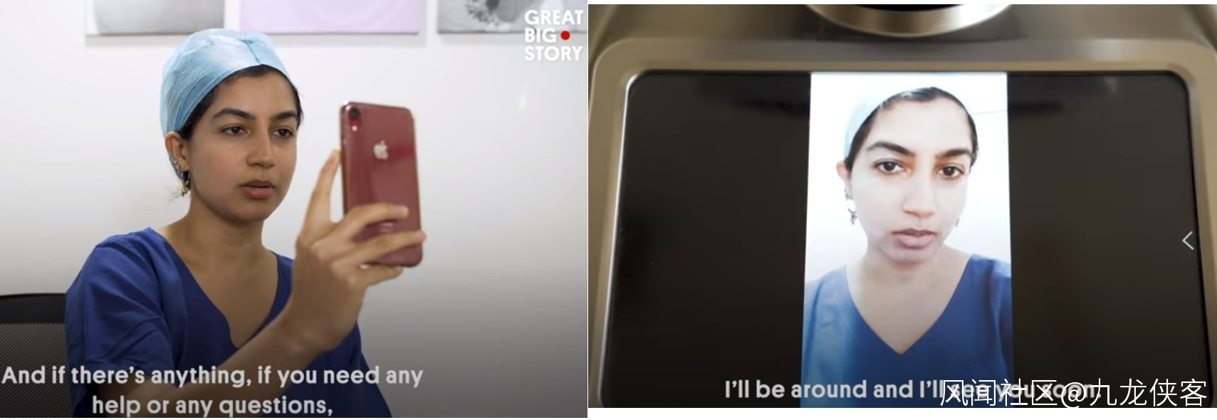 下圖為醫生通過手機軟件與病患遠程溝通的示例。病患可在機器人的屏幕上看到醫生的影像。