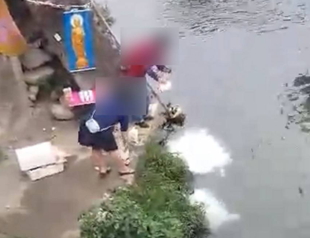 同時也為了祈福範圍更加多元,幾位大媽倒牛奶的同時,還在身後佛祖像的注視下,繼續往河裏放生了幾箱牛蛙鯰魚這類水產。