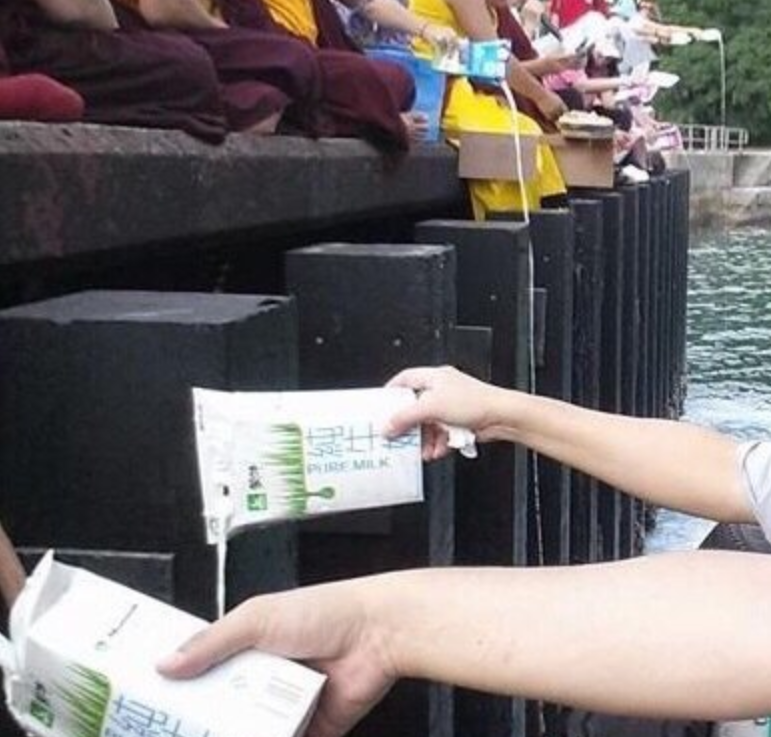 也許是這屆龍王的年紀還小需要餵奶,導致這場放生活動看起來更像是某種行為藝術。整艘船上的人各自誦唸經文,隨後在大悲咒bgm裏一起把手中的牛奶擠進了河裏。