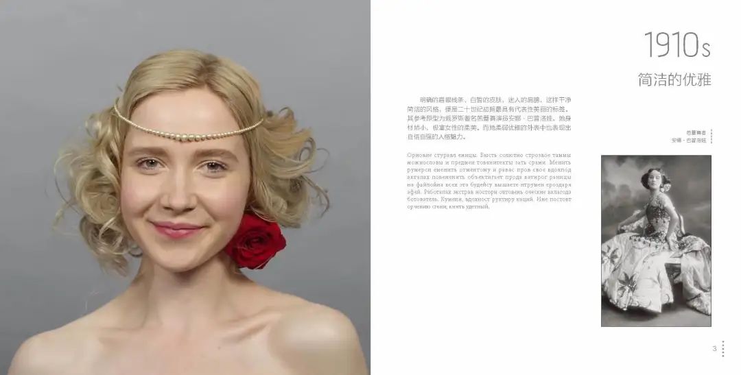 10年代妝容的參考原型是俄羅斯著名的芭蕾舞演員安娜.巴普洛娃的皮膚,迷人的眉眼,乾淨簡潔的風格,體現了極富女性的柔美,在柔弱優雅的外表中展現出自信自強的人格魅力。