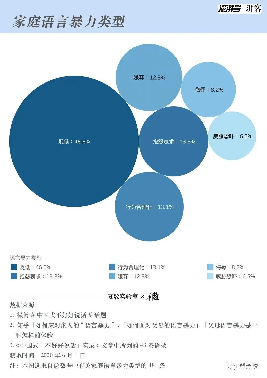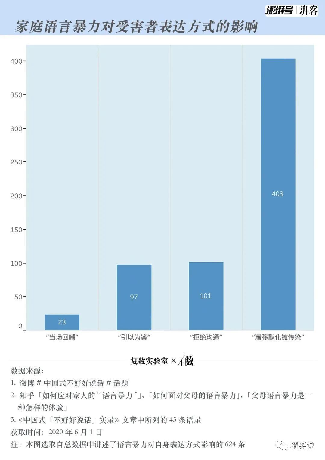 根據自媒體“湃客工坊”發佈的調查數據顯示,在能夠識別出的語言暴力施暴主體中,“媽媽”、“爸爸”、“父母”這三類身份出現的次數最多。也就是説,在一個孩子的成長過程中,會接收到更多來自父母和家庭的語言暴力。