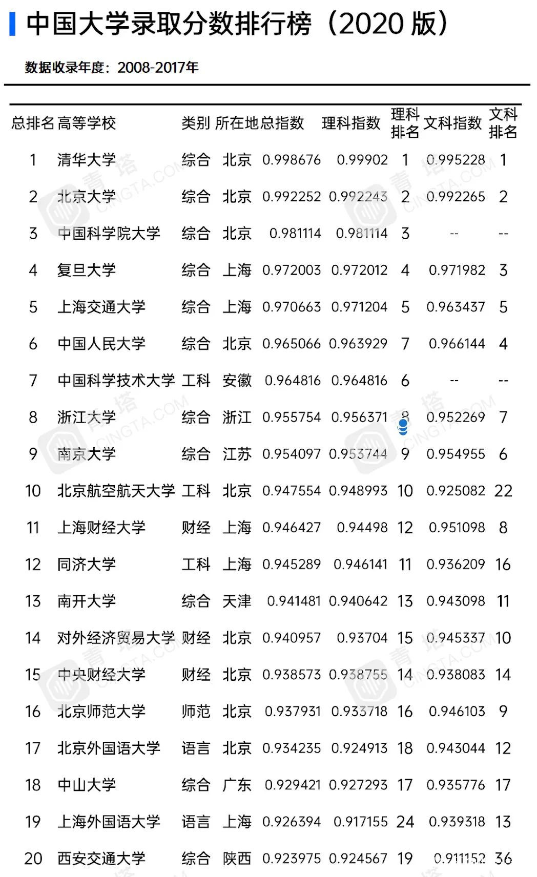 話不多説,先來看看過去10年中國最難考的20所高校排名: