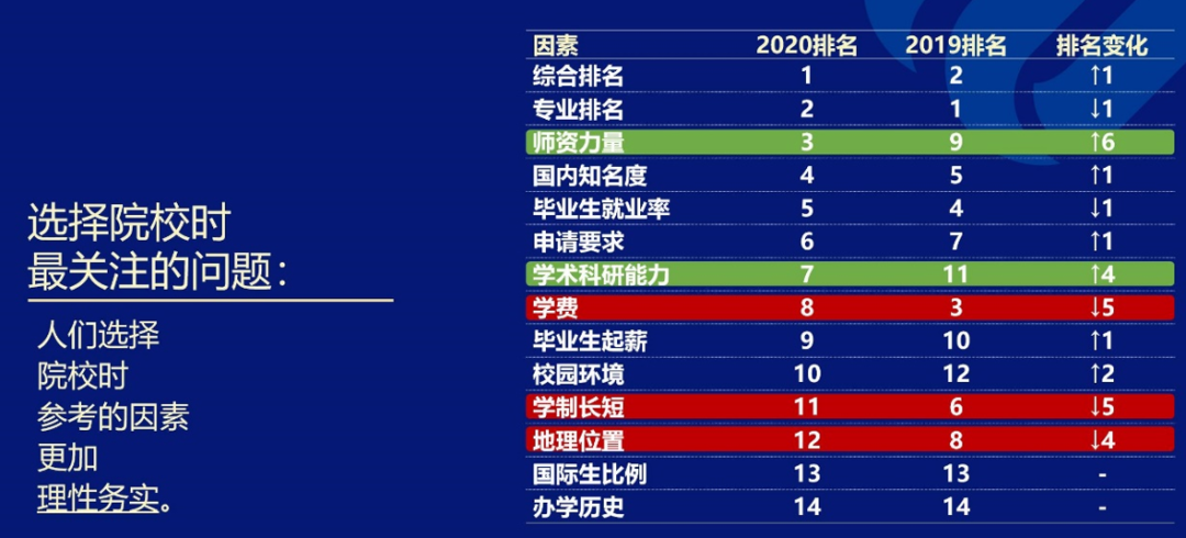 除了意向國家地區的選擇方面,現階段準留學生們選擇院校時所考慮的因素也出現變化。根據啓德教育調研的結果顯示,現階段留學生在選擇院校時,對“師資力量”的關注程度從2019年的第9位上升至第3位;對“學術科研能力”的重視程度從2019年的第11位上升至第7位。