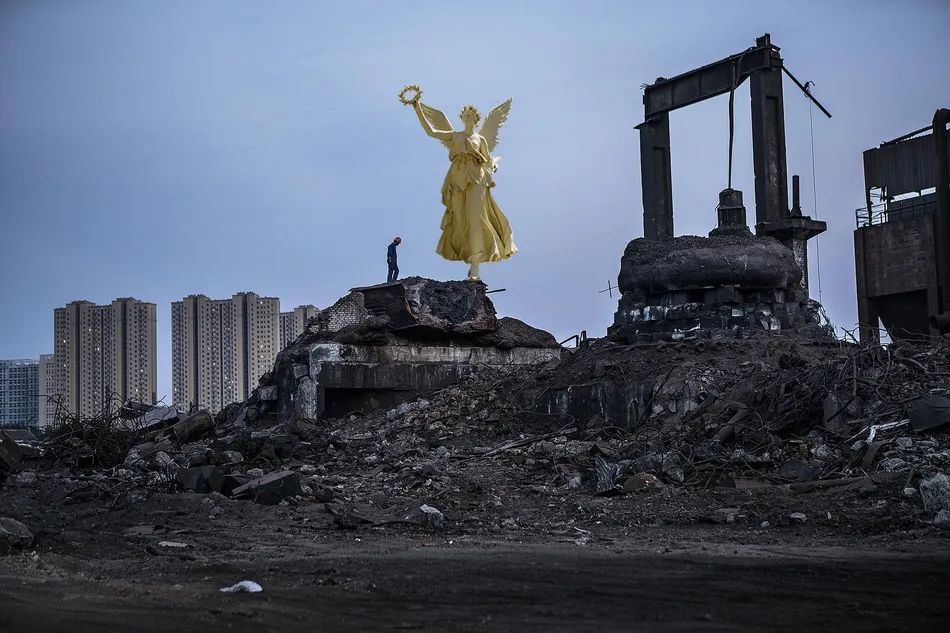 這是在工地的廢墟上面,有一個建築工人站在頂端,也不知道是在沉思還是在幹什麼。我給他配了一個手持花環的雕像,看起來好像這個天使要給他加冕一樣,這個作品的名字叫《高山下的花環》。