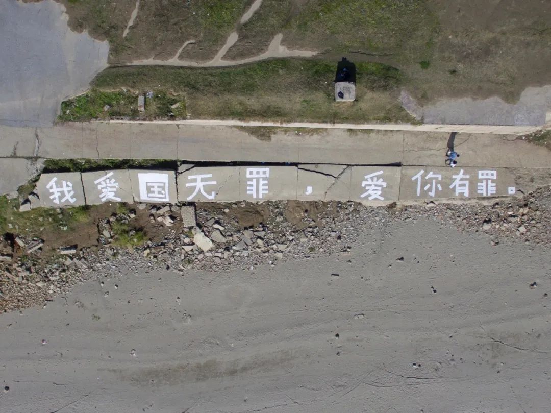 我當時到了長江邊,看到有條路的一半都是垮塌的。當天晚上我就回去,買了滾筒,買了油漆,又回到這裏,半夜塗了這幾個大字,“我愛國無罪,愛你有罪”。在塗這個“國”的時候我還不小心塗錯了,這個“國”顯得特別粗。