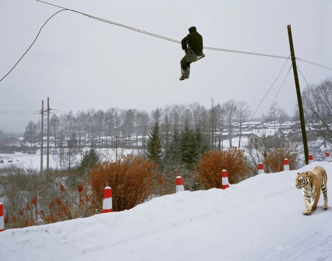 這是原本有一個電工在維修線路,我想如果我加一隻老虎,看起來好像電工是被老虎趕上去的一樣。配了一個名字,叫《給親戚看到我一個人食吉野家》。