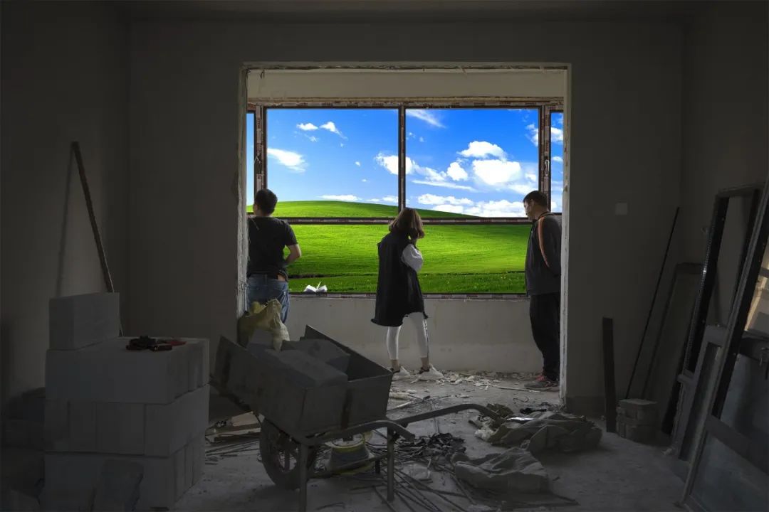 這是一個建築工地,外面是一片廢墟,我把他們窗外的風景換成了桌面。