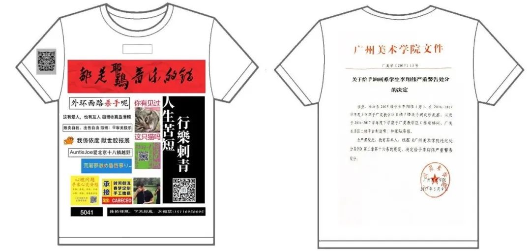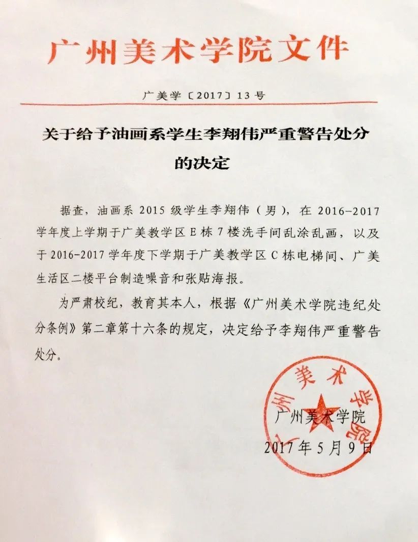 終於在2017年的5月9號,廣州美術學院給了我一個嚴重警告的處分。