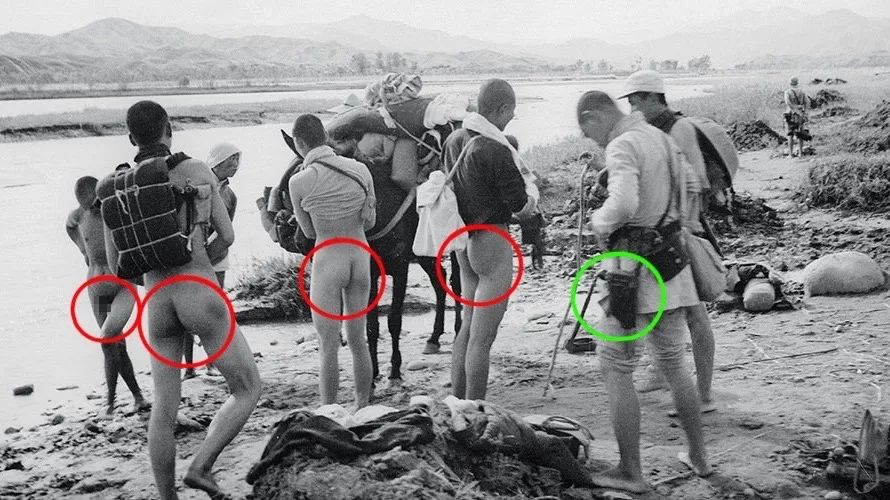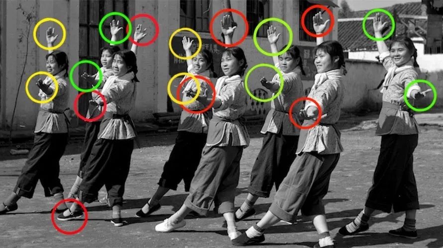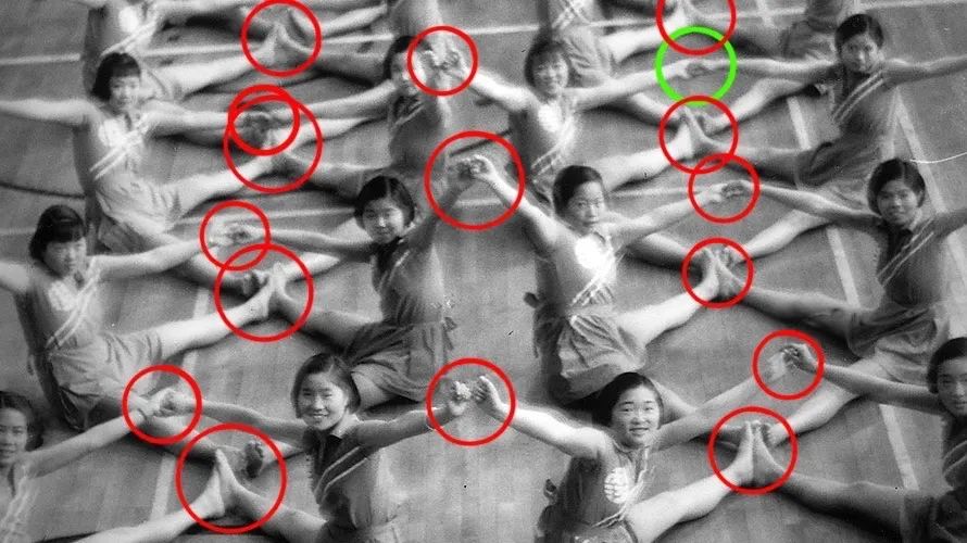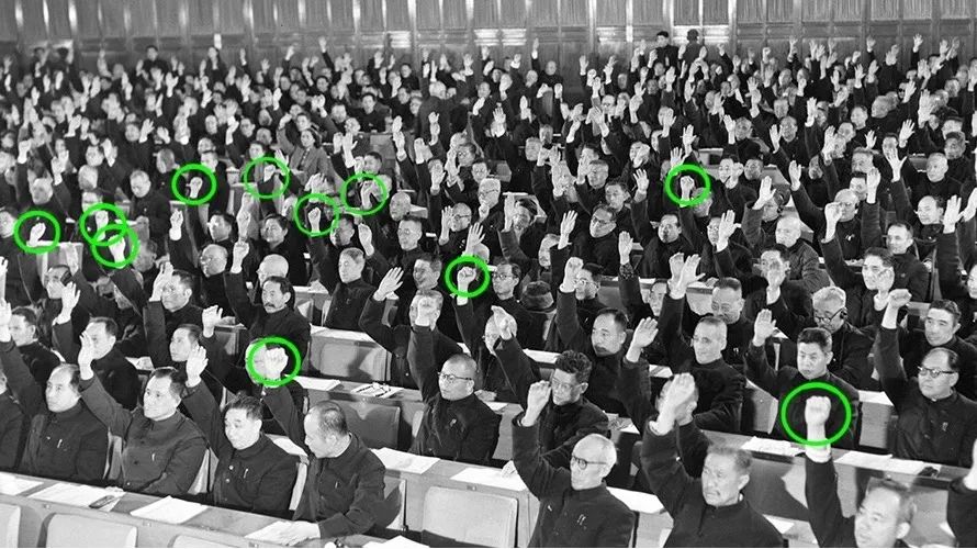 真正開始改造別人的圖像是在2016年,成系統地做大概是2017年。當時我在網上找了一系列的老照片,像現在大家看到的這張。我發現雖然所有人都在舉手,但他們的手勢是不一樣的。我就乾脆用圈圈把舉拳頭的和舉布的區分出來,重新給它取一個名字:《剪刀石頭布》。
