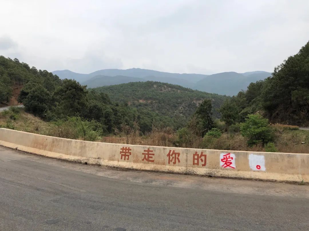 改完之後我跟朋友騎着摩托車繼續往前走,走着走着下雨了,無奈我們就要折返。返回的時候我們又路過了這個彎道,當時還下着小雨,我騎着摩托車往前走,在這個轉彎處,我看到“帶走你的愛”這五個大字在往後走。