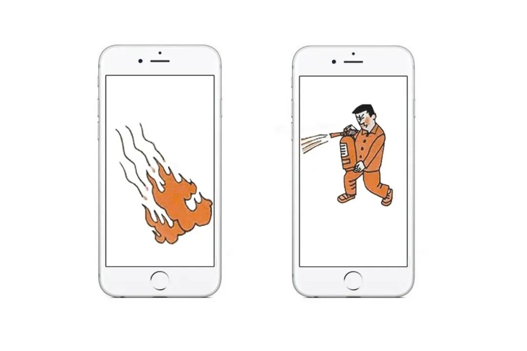 這張圖片是兩個手機,其中一個手機裏面有個小人拿着滅火器想救火,但是着火的地方是在另一個手機裏,他是救不到這個火的。