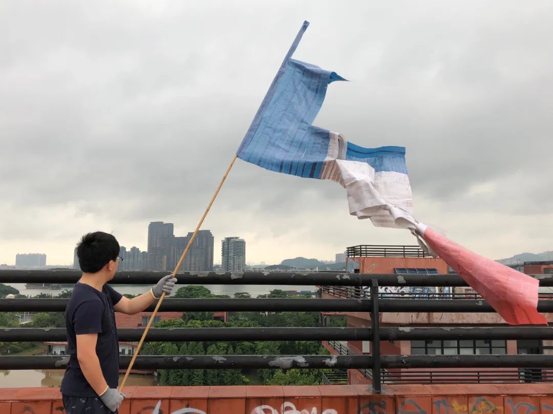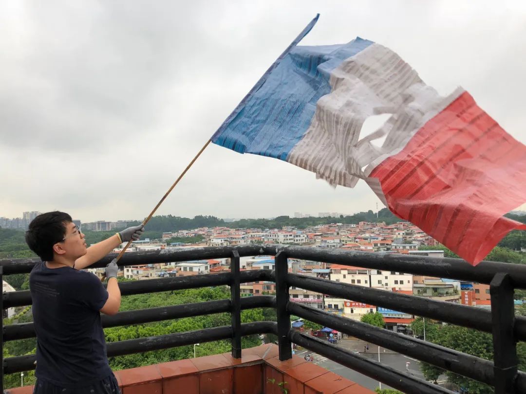 我把它們收集了起來,裁成一條一條的,重新拼湊成了一面法國國旗。做好了之後,我就拿着這面法國國旗到天台上去搖。