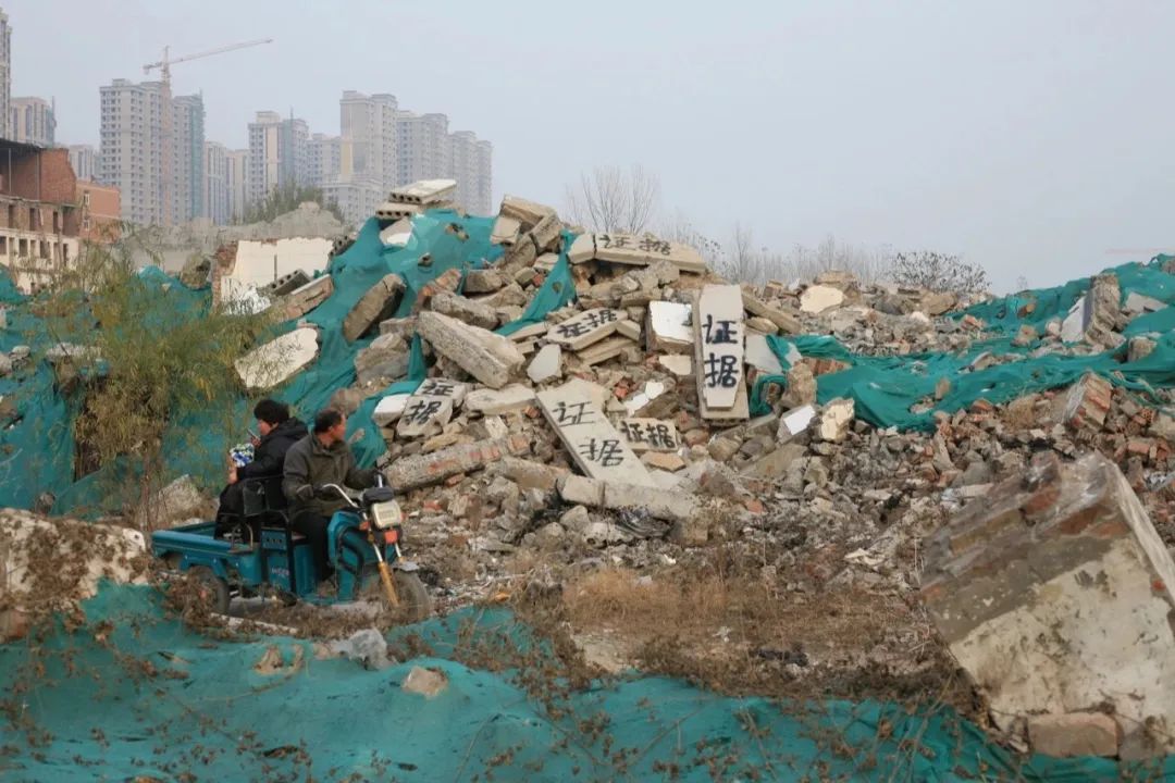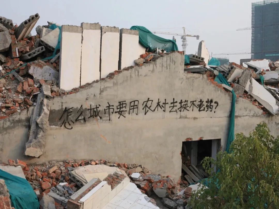 這是一個城中村,廢墟的後面你就可以看到萬達,我在一面廢牆上寫下了“他們的微笑是我們的證據”。
