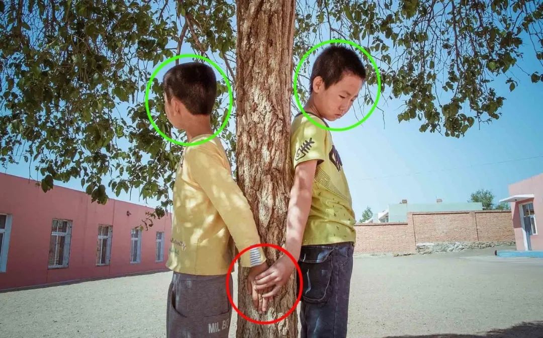 這一張是兩個小男孩在一棵樹下面和好,叫《少生孩子多種樹》。