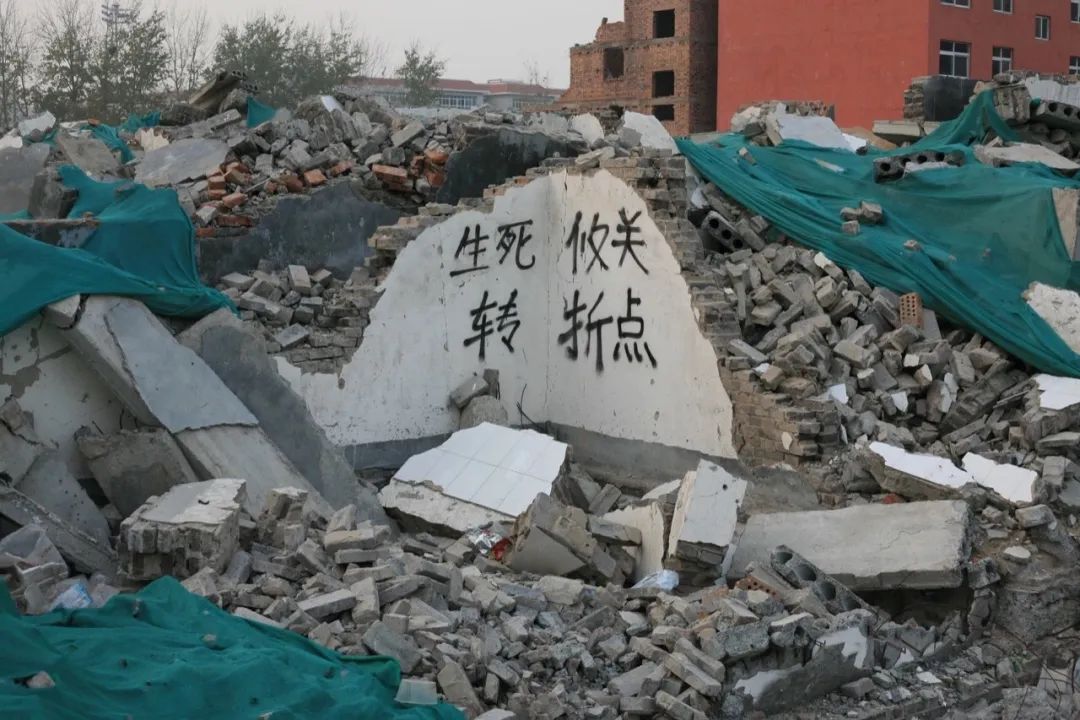這一張圖片是在廢墟里,拆遷拆到只剩下這一個拐角,我在拐角這個地方寫了“生死攸關轉折點”。