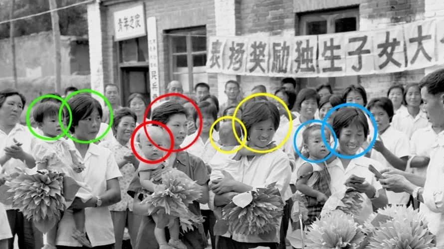 好比説這一張,它的背景是表揚獎勵獨生子女大會,我用奧運五環的顏色把他們的母親和孩子圈了起來,配合的標題是《冠軍只有一個》,這種在競技體育裏面會用到的詞語。