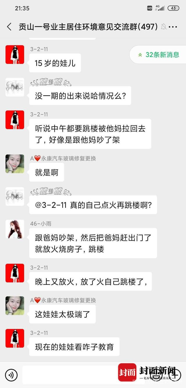 “聽説中午就跟他媽媽吵了架,要去跳樓被拉了回來。”事情發生後,貢山壹號的業主交流羣炸開了鍋,不少業主在羣裏爆料。“聽説後來晚上又和父母吵了架,把父母趕出了門,然後放火燒房子,自己跳樓。”