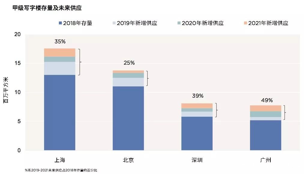 以上數據選自第一太平戴維斯發佈的《2018中國寫字樓報告》,上海、北京、深圳、廣州是中國甲級寫字樓存量最大的四個城市。